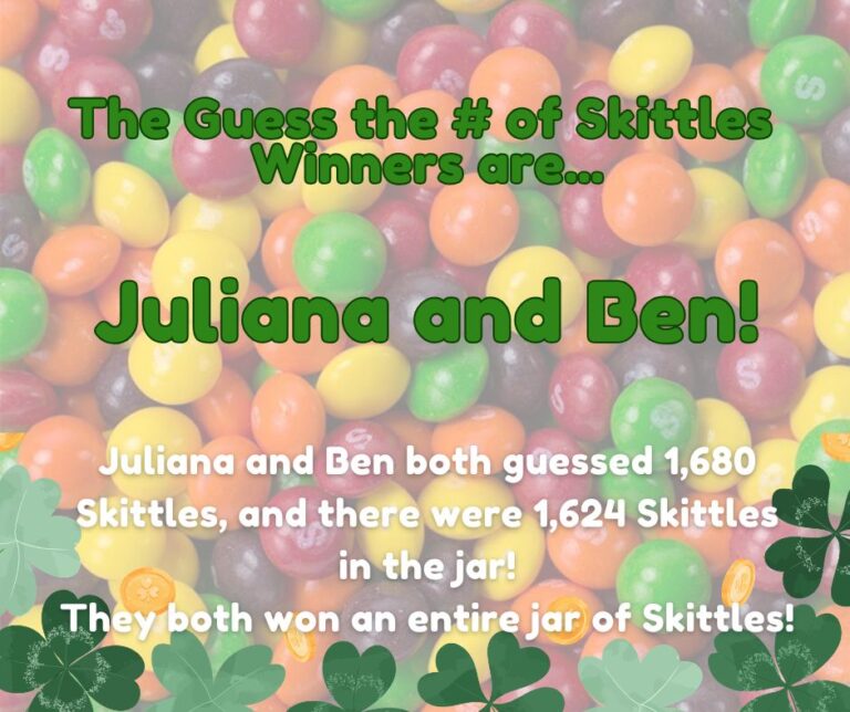 We had hundreds of guesses, but I am thrilled to announce our “Guess the # of Skittles” winners: Juliana and Ben!